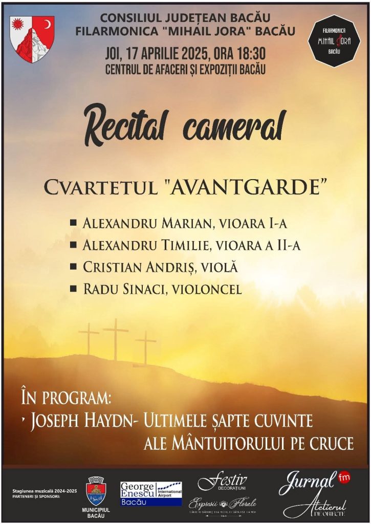 Astăzi, 17 aprilie 2025, ora 18:30, iubitorii muzicii clasice din Bacău sunt invitați la un recital cameral de excepție, susținut de Cvartetul „Avantgarde”, la Centrul de Afaceri si Expoziții din oraș. În apropierea sărbătorilor pascale, Cvartetul „Avantgarde” vă invită să audiați lucrarea compusă inițial de Joseph Haydn în anul 1787, pentru orchestră. Compoziția i-a fost solicitată de o biserică spaniolă, pentru slujba din Vinerea Mare.